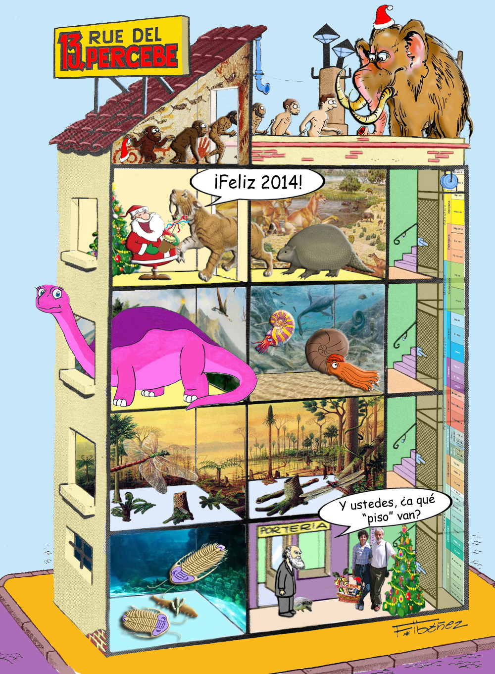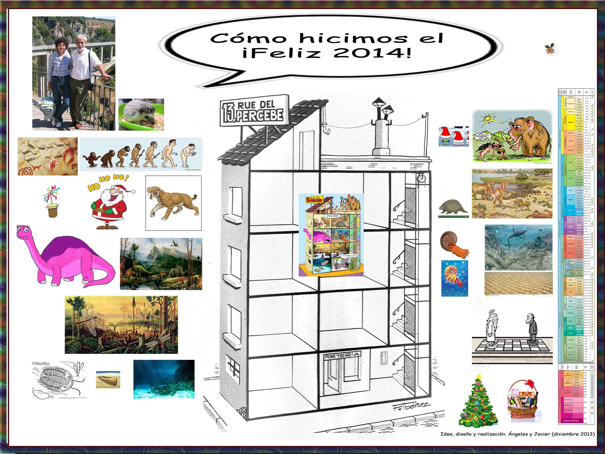Estas fiestas las vamos a celebrar con esta peculiar comunidad de vecinos. Si os queréis apuntar, ¡ojo! no cojáis el ascensor, es un poco lento, puede tardar millones de años en subir. Si quieres saber cómo lo hicimos: PINCHA AQUÍ. Algunos cotilleos de este inmueble y sus habitantes: Portero, Moneypenny, Papá Noel, piso, ascensor, sótano, bajo (trilobites, mureropodio), primero, segundo (dino, ammonites), tercero ("gatito", gliptodonte), ático ("los nuevos", mamut). |